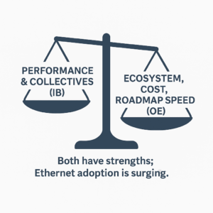 - If you value ecosystem choice, DC skill reuse, and long-term TCO, and you’re willing to engineer lossless behavior, Open Ethernet (RoCEv2 now, UEC next) is compelling—and increasingly the default for hyperscale and GPU clouds.